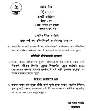 सञ्चार तथा सुचना प्रबिधि मन्त्री पृथ्वी सुब्बा गुरूङले ‘चलचित्र बिधेयक, २०८१ लाई दफावार छलफलका लागि बिधायन ब्यवस्थापन समितिमा पठाइयोस भन्ने प्रस्ताव सभासमक्ष प्रस्तुत गर्ने सम्भावित कार्यसुचीमा उल्लेख छ ।