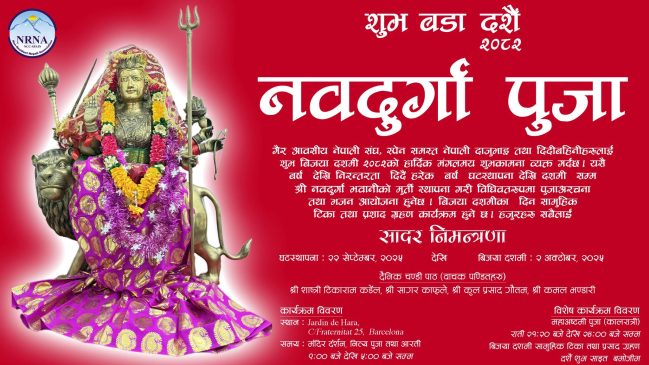बार्सिलोना, बार्सिलोनाको ग्रासियास्थित Jardin de Hara मा यस वर्ष गैर आवासीय नेपाली संघ (NRNA) स्पेन परिवारले भव्य दुर्गा पूजा आयोजना गर्ने भएको छ।