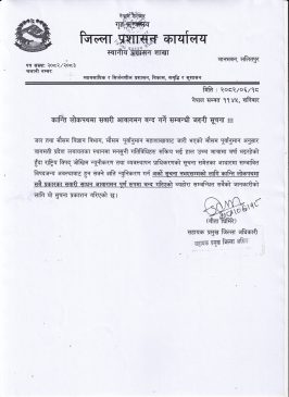 प्रशासनले जनताको सुरक्षालाई मध्यनजर गर्दै सतर्कता अपनाउन सबैलाई आग्रह गरेको छ ।