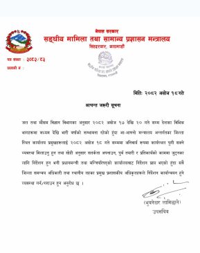 प्रधानमन्त्री तथा मन्त्रिपरिषद्को कार्यालयबाट प्राप्त निर्देशनअनुसार मन्त्रालयले असोज १८ गतेभित्र सबै जिल्लास्थित कार्यालय प्रमुखहरूले कार्यस्थलमा पुगिसक्ने व्यवस्था मिलाउन भनेको हो ।