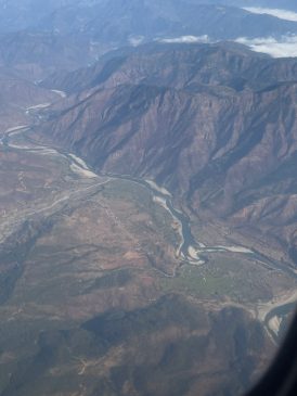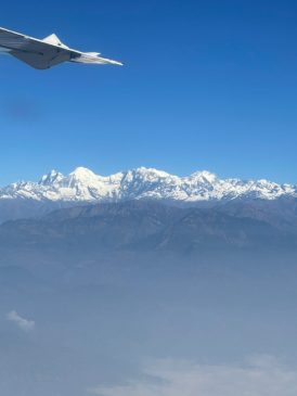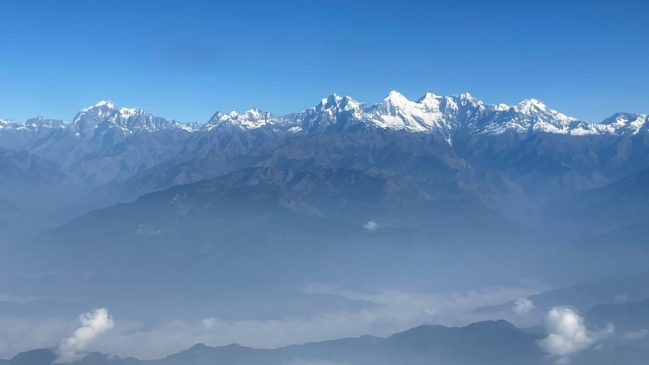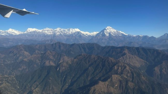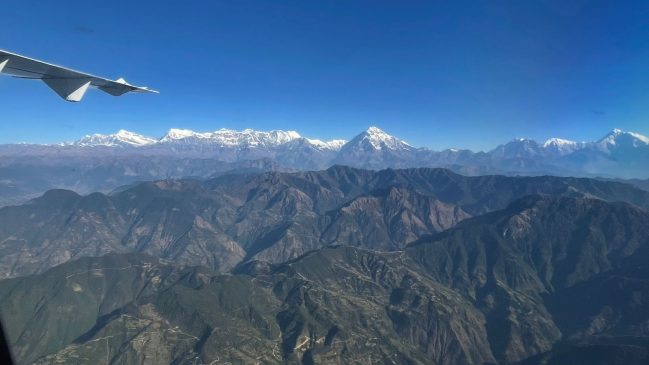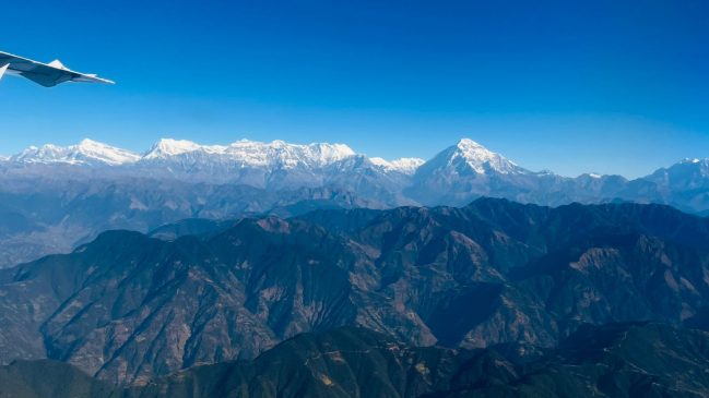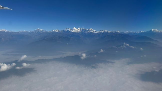 काठमाडाैंबाट धनगढी उडानका क्रममा जहाजको झ्यालबाट देखिएको हिमाल र पहाडी भू–दृश्य । पश्चिमतर्फको उडानमा मौसम खुला रहेकाले टाढासम्म फैलिएको हिमाली शृङ्खला, पहाडी भू–भाग र बादलको हल्का तह स्पष्ट रूपमा देखिएको छ । यात्राका क्रममा देखिएको यस्तो दृश्यले नेपालको विविध भूगोल र प्राकृतिक सुन्दरताको झल्को दिन्छ।