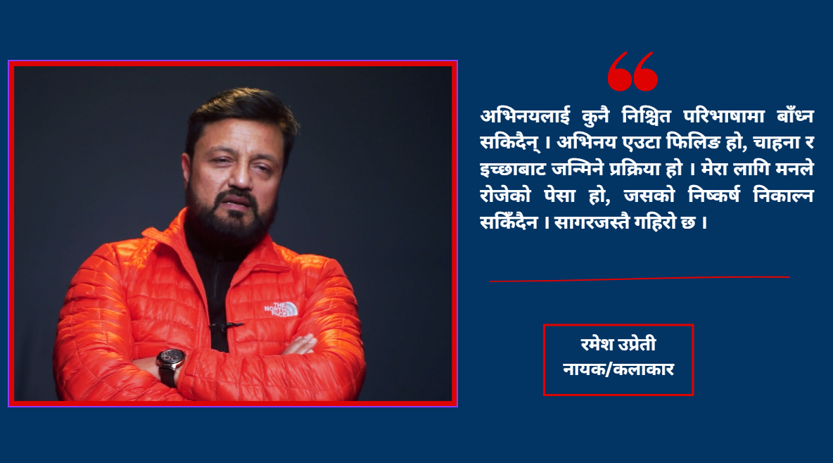 नेपाल न्यूज बैंकसँगको कुराकानीमा उप्रेतीले अभिनयलाई कुनै निश्चित परिभाषामा बाँध्न नसकिने अनुभवको रूपमा व्याख्या गरे । ‘अभिनय एउटा फिलिङ हो, चाहना र इच्छाबाट जन्मिने प्रक्रिया हो,’ उनले भने, ‘यो मनले रोजेको पेसा हो, जसको निष्कर्ष निकाल्न सकिँदैन । सागरजस्तै गहिरो छ ।’