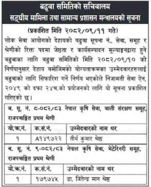 बढुवा समितिको बिहीबार बसेको बैठकको निर्णयअनुसार नेपाल कृषि सेवा अन्तर्गत बाली संरक्षण समूहका राजपत्रांकित प्रथम श्रेणीका एक जना र भेटेरिनरी समूहका राजपत्रांकित प्रथम श्रेणीका एक जना कर्मचारी सहसचिव पदमा बढुवाका लागि सिफारिस सूचीमा परेका छन् । सिफारिस भएका कर्मचारीहरूको बढुवा प्रक्रिया प्रचलित कानुन तथा नियमावली अनुसार अगाडि बढाइने मन्त्रालयले जनाएको छ ।