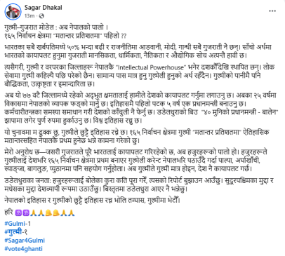 आगामी निर्वाचनमा गुल्मीले १६५ निर्वाचन क्षेत्रमध्ये ‘मतान्तर प्रतिशतका आधारमा’ सबैभन्दा ठूलो जित हासिल गर्ने विश्वास ढकालले व्यक्त गरेका छन् । साथै, गुल्मीको प्रभाव छिमेकी जिल्ला पाल्पा, अर्घाखाँची, स्याङ्जा, बागलुङ र प्युठानसम्म विस्तार हुने उनको दाबी छ ।