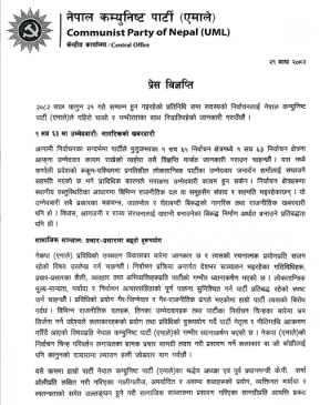काठमाडौं । नेपाल कम्युनिष्ट पार्टी (एमाले) ले आगामी फागुन २१ गते हुन गइरहेको प्रतिनिधिसभा सदस्य निर्वाचनलाई गम्भीर चासोका साथ नियालिरहेको जनाएको छ । बुधबार पत्रकार सम्मेलन गर्दै एमालेले देशभरका १६५ निर्वाचन क्षेत्रमध्ये १६३ क्षेत्रमा आफ्ना उम्मेदवार कायम राखेको जानकारी दिएको हो ।