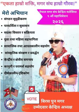 मलेसिया। मलेसियामा क्रियाशील मगर समुदायलाई अझ सशक्त, पारदर्शी र युवामैत्री बनाउने लक्ष्यसहित बिरस पुन मगरले मगर संघ मलेसियाको केन्द्रीय अध्यक्ष पदमा उम्मेदवारी घोषणा गरेका छन्।