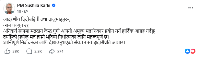 बिहीबार बिहानै सामाजिक सञ्जालमार्फत एक सन्देश जारी गर्दै प्रधानमन्त्री कार्कीले सबै दिदीबहिनी तथा दाजुभाइहरूलाई मतदान केन्द्र पुगेर आफ्नो अमूल्य मताधिकार प्रयोग गर्न आह्वान गरेकी हुन् ।