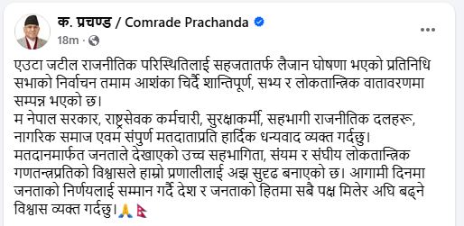 प्रचण्डले समाजिक सञ्जालमा लेख्दै नेपाल सरकार, राष्ट्रसेवक कर्मचारी, सुरक्षाकर्मी, सहभागी राजनीतिक दलहरू, नागरिक समाज तथा सम्पूर्ण मतदाताप्रति हार्दिक धन्यवाद व्यक्त गरेका छन् । उनका अनुसार मतदानमार्फत जनताले देखाएको उच्च सहभागिता, संयम र संघीय लोकतान्त्रिक गणतन्त्रप्रतिको विश्वासले देशको लोकतान्त्रिक प्रणालीलाई अझ सुदृढ बनाएको छ ।