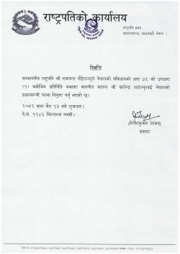शुक्रबार उनले नेपालको संविधानको धारा ७६ (उपधारा १) बमोजिम प्रधानमन्त्री पदमा नियुक्त गरेका हुन् ।