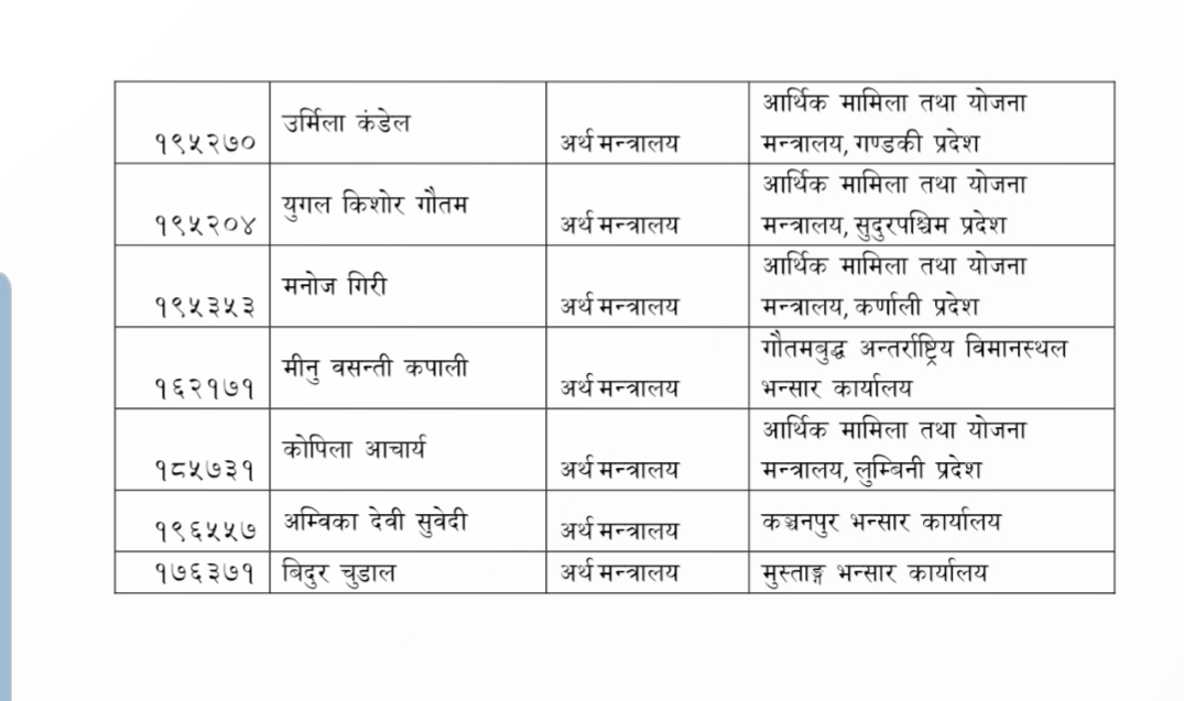 अर्थमन्त्री डा.स्वर्णिम वाग्लेले १५ गतेको मन्त्रिस्तरीय निर्णयबाट अर्थ मन्त्रालयका ३० जना उपसचिवको एकैपटक पदस्थापन तथा सरुवा गरेका हुन् ।