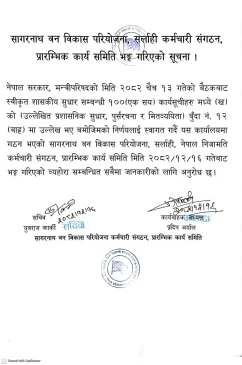 सर्लाही । सर्लाहीस्थित सागरनाथ वन विकास परियोजनामा क्रियाशील कर्मचारी संगठन सरकारले गरेको निर्णयलाई स्वागत गर्दै भंग गरिएको छ ।