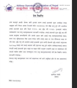 हवाई इन्धनको मूल्य वृद्धि कारण वायुसेवा संचालित संघका सदस्य वायुसेवा कम्पनीहरूले आफ्नो उडान भाडा र हेलिकप्टर भाडा दर स्वतः समायोजन गर्ने भएका हुन् ।