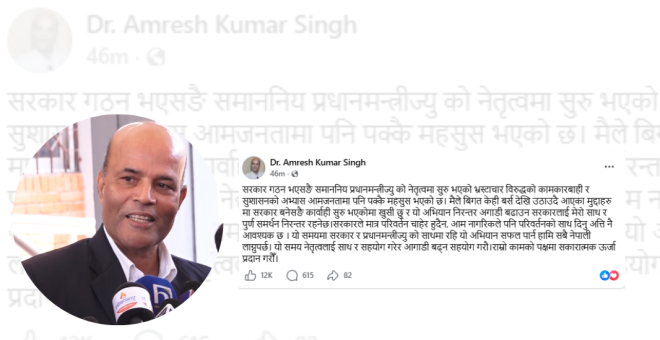 काठमाडौं । अमरेस कुमार सिंह ले सरकार गठनसँगै सुरु भएको भ्रष्टाचारविरुद्धको अभियान र सुशासनको अभ्यासप्रति सकारात्मक प्रतिक्रिया व्यक्त गरेका छन् ।