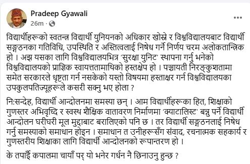 ‘विद्यार्थी संगठनलाई निषेध गर्नु समस्याको समाधान होइन । समाधान त उनीहरुसँग संवाद,रचनात्मक सहकार्य र गुणस्तरीय शिक्षाका लागि विद्यार्थी आन्दोलनको रुपान्तरण हो’ ज्ञवालीले सामाजिक सञ्जालमा लेखेका छन् ‘के तपाईं कपालमा चाया पर्यो भनेर गर्धन नै छिनाउनु हुन्छ ?’