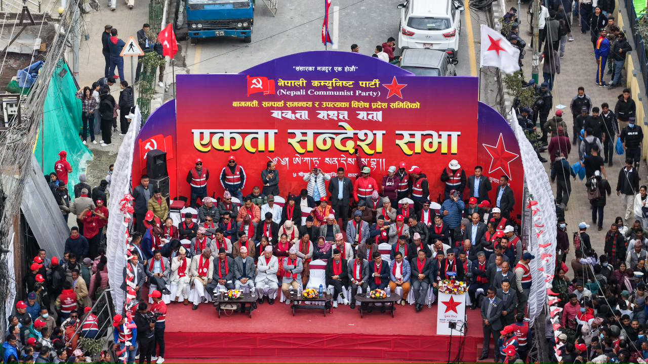 नेपाली कम्युनिस्ट पार्टीले काठमाडौंमा शक्ति प्रदर्शन गरेको छ । शनिबार बागमती प्रदेश कमिटीले विभिन्न र्यालीसहितको प्रदर्शनपछि भृकुटीमण्डपमा एकता सन्देश सभा आयोजना गरेको हो । नेता कार्यकर्ताहरू काठमाडौंका विभिन्न स्थानबाट र्यालीहरूसहित पद्मोदय अगाडिको मुख्य मञ्चमा पुगेर अहिले सभा गरिरहेका छन् । सभालाई पार्टीका संयोजक पुष्पकमल दाहाल ‘प्रचण्ड, सहसंयोजक माधवकुमार नेपाललगायतका नेताहरूले सम्बोधन गरेका छन् ।