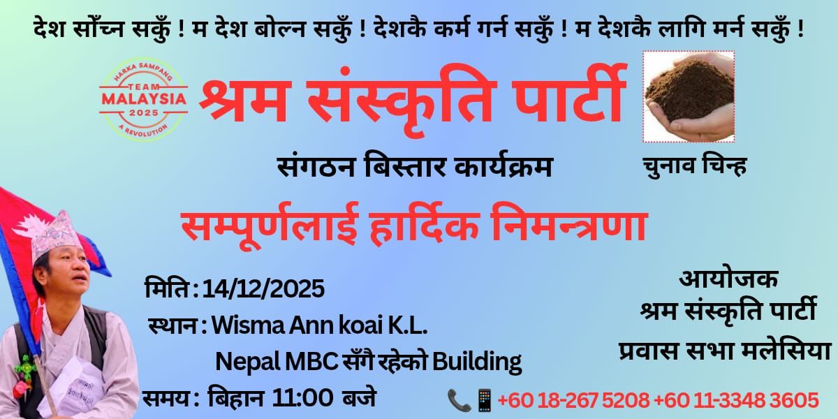 क्वालालम्पुर – श्रम संस्कृति पार्टी, प्रवास सभा मलेसियाले आगामी १४ डिसेम्बर २०२५ मा वैदेशिक रोजगारमै रहेको नेपाली समुदायलाई लक्षित गरी संगठन विस्तार कार्यक्रम आयोजना गर्ने भएको छ। “देश सोच्न सकूँ, म देश बोल्न सकूँ, देशकै कर्म गर्न सकूँ, म देशकै लागि मर्न सकूँ” भन्ने मूल नारासहित आयोजना हुन लागेको यो कार्यक्रम पार्टीको प्रवासमै पहिलो ठूलो भेला मानिएको छ। कार्यक्रम Wisma Ann Koai, K.L. (Nepal MBC रहेको भवन) मा बिहान ११:०० बजे सुरु हुनेछ। पार्टीका अनुसार मलेसियामा रहेका श्रमिकहरूको हक-अधिकार, सुरक्षा, वेतन तथा कागजपत्रसम्बन्धी समस्या, र प्रवासी नेपालीहरूको सामाजिक–राजनीतिक सहभागिताबारे महत्वपूर्ण…