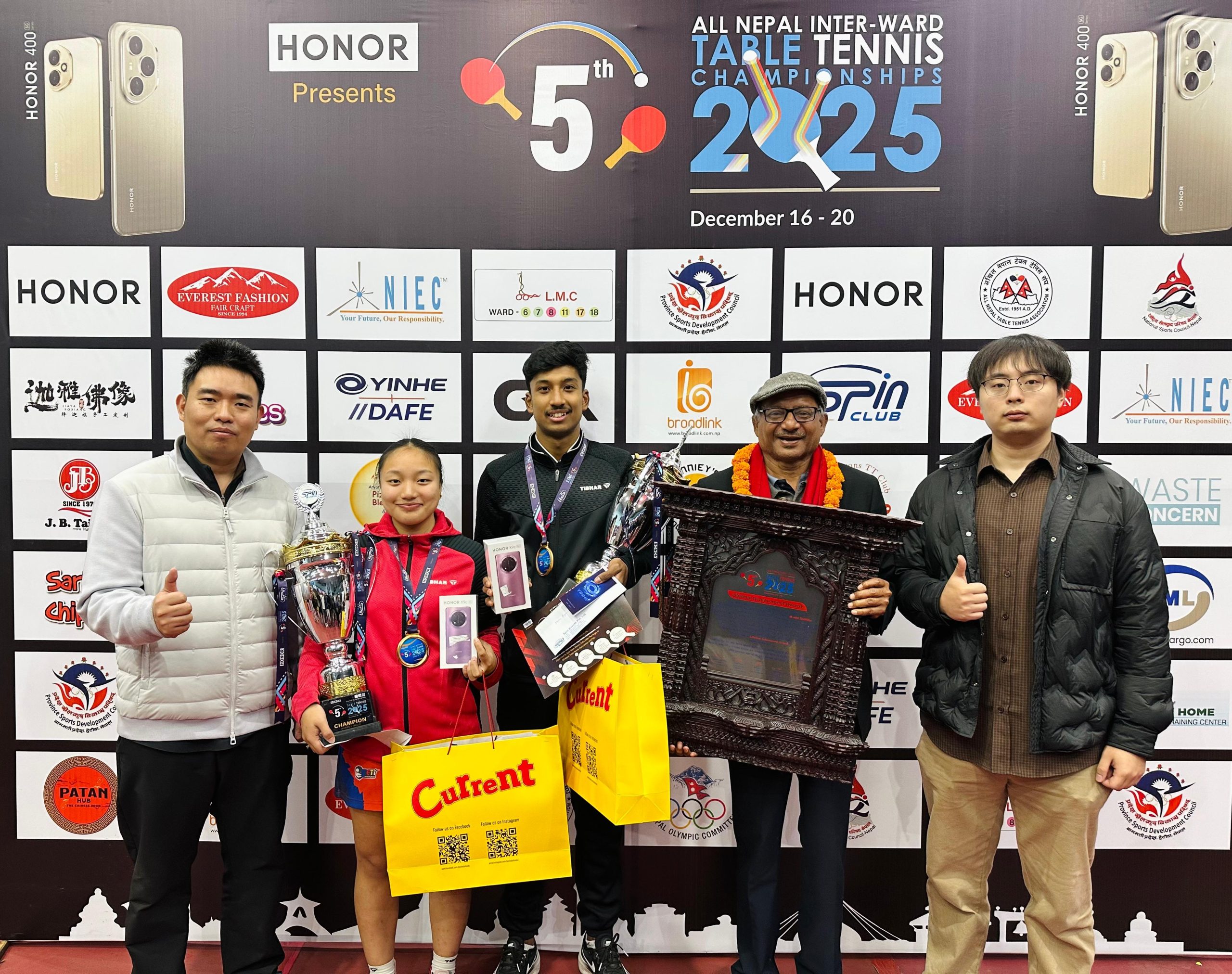 काठमाडौं, पुस ५ गते । ललितपुर महानगरपालिका ८ का रुविन महर्जन र शिवसताक्षी ८ की इभाना थापाले पाँचौं अल नेपाल अन्तरवडा राष्ट्रिय टेबलटेनिस प्रतियोगितामा शनिबार स्वर्ण जितेका छन् । खुला सिंगल्सको पुरुषमा रुविन र महिलामा इभाना च्याम्पियन बनेका हुन् । लैनचौरस्थित राष्ट्रिय टेबलटेनिस प्रशिक्षण केन्द्रमा भएको पुरुष फाइनलमा रुविनले ललितपुर १६ का संयोग कपालीलाई ४–११, ११–८, ६–११, ११–५, १४–१२ र ११–९ को सेटमा पराजित गरे । बेलकोटगढी ८ का गनन्जय दाहाल र ललितपुर ७ का एलेक्स महर्जन तेश्रो भए । महिलाको उपाधि भिडन्तमा इभानाले संखुवासभा ४ की वियंका राईलाई ७–११,…