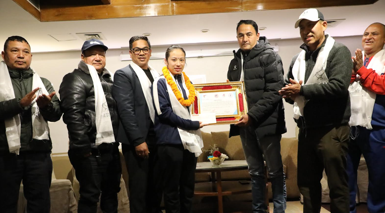 काठमाडौं, पुस ४ गते । काठमाडौं जिल्ला तेक्वान्दो संघले पाँचौं एसियाली युथ पारा गेम्सको तेक्वान्दोमा कास्य पदक जितेकी रेनु तामाङलाई शुक्रबार नगद १५ हजारसहित सम्मान गरेको छ । सोही अवसर उनका प्रशिक्षक कविराज नेगी लामा पनि प्रशंसा पत्रबाट सम्मानित भए । उनीहरुलाई राष्ट्रिय खेलकुद परिषद् (राखेप) कार्यकारी समितिका सदस्य भानबहादुर चन्द, राखेपका सदस्य रामचन्द्र श्रेष्ठ, काठमाडौं जिल्ला तेक्वान्दो संघका अध्यक्ष विक्रम खड्गीलगायतले ठमेलस्थित नेपाली घरमा आयोजित कार्यक्रममा सम्मान गरे । रेनुले दुबईमा डिसेम्बर ७ देखि १४ तारिखसम्म भएको एसियाली युथ पारा गेम्सअन्तर्गत के–४४ क्याटगोरीको महिला ४७ केजीमुनि कांस्य जितेकी थिइन्…